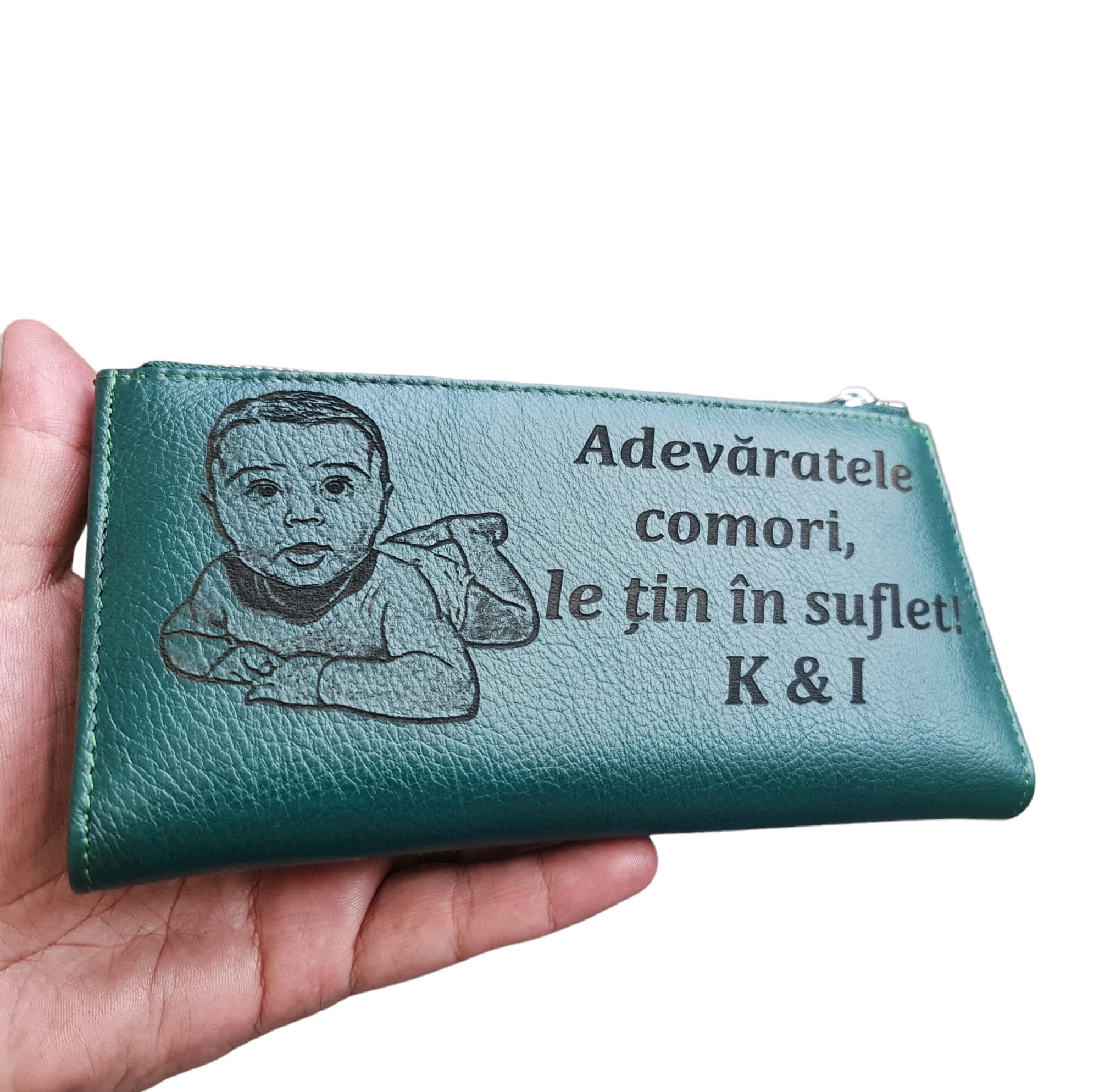 Portofel Personalizat ‘Adevaratele comori’, dama, piele naturala, verde, 12.5 x 10 x 2.8 cm