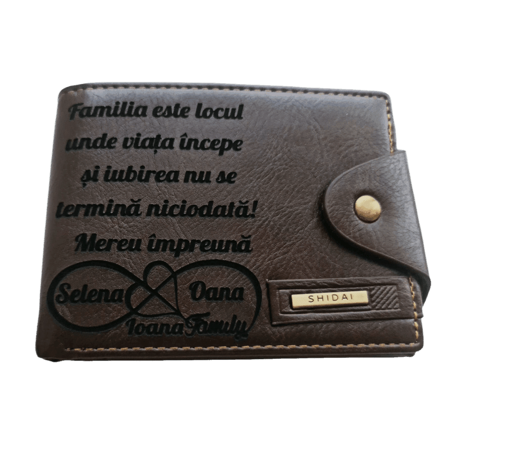 Portofel Personalizat ‘Familia este locul’, barbati, piele , cu capsa, maro,